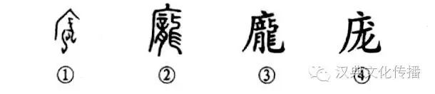 “龐然大物也,以為神。”這個(gè)“龐”字本為會(huì)意字。甲骨文①是在屋子下面有一巨龍,意味著這屋子實(shí)在高大。②是小篆的形體,其中的“龍”形變得不像了,筆畫極為復(fù)雜。③是楷書繁體字,與小篆極為相似。④是簡(jiǎn)化字。
