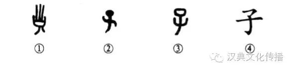 這是“伢子(小孩)爭分守歲錢”的“子”字。甲骨文①就是一個小孩之形,頭上長了三根頭發,真像《三毛流浪記》中的“三毛”形象。②是金文的形體,是一個剛出生的嬰兒,上部是頭,左右是兩臂,兩腿是用小被裹在一起的樣子。小篆③也同于金文的形體。④是楷書的寫法。