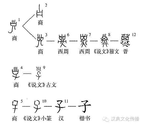 象形字。“子”字在商代文字中有三系寫法:第一系像生有發的胎兒頭顱及兩脛,后或省簡其發,或于頭部標記其囟;該字至宗周形稍變,上肢為襁褓包裹,其后形體稍訛,至《說文》籀文則在字下加一符號,許慎解為“幾”,謂“籀文子,囟有發,臂、脛在幾上”。在甲骨文中用作表示天于地支的“子”。第二系,上像幼兒頭發、頭顱及兩臂,下像兩并的兩脛,后演進為《說文》古文。第三系與第二系的區別僅在于頭發的有無,后演進為小篆及隸書。“子”的本義為嬰兒,只顯示年齡而不計性別,引申為動物的幼仔,又引申為動物的卵與植物的果實或種子;又引申為細小的物件。“子”,假借為地支字。用于紀月,指十一月;用以紀時,指二十三時至一時;在太歲紀年法中亦用以紀年,《爾雅·釋天》:“太歲在子日困敦。”與天干相配,可用以紀年,亦可用以紀日。“子”,有時假借為“字”,指撫養、養育。《殷虛書契前編》4.26.7:“己亥卜,王:‘余弗其子婦蛭子?’”(李義海)