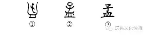 這是“孟冬之月”的“孟”字,本為會意字。①是金文的形體,像器中有一個嬰兒(子),表示給初生嬰兒沖洗。②是小篆的形體,下部寫作“皿”。③為楷書的寫法。