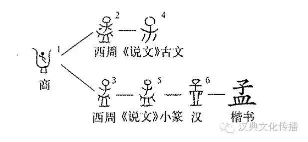 ”演進為“皿”,該字遂分為二系:一系“皿”中有水,后又省“皿”,演進為《說文》古文;一系秉襲商代金文,后來演進為《說文》小篆與隸書。因為由容器形訛而來的“皿”字與“孟”字讀音相同(均屬明紐陽部),故而許慎曰:“從子,皿聲。”“孟”本義為首生,也就是排行中的“長”,亦即老大。《說文》:“孟,長也。”引申為始。《楚辭離騷》:“攝提貞下孟陬兮。”王逸注:“孟,始也。”(李義海)