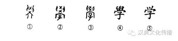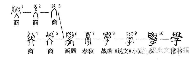 為聲,爻就為古學曾以為聲的孑遺。西周的學字,為突出學習的對象是兒童,又加表意偏旁子。春秋時,??作兩又是前代從廾的烙印。隸變后楷書作學,簡化作學。字中