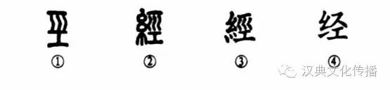 這個“經正而后緯成”的“經”字原是個象形字。金文①的下部是織布時撐線用的“工”,上部的三條曲線就是織布的“經線”之形。②是小篆的形體,為了使其“經線”的詞義更為明確,所以又在其左增加了表意部分“纟”,這樣“經”字就變成了左形右聲的形聲字了。③是楷書的寫法。④是簡化字。