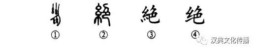 這是“絕處逢生”的“絕”字,本為會意字。①是金文的形體,用“刀”斷“絲”,表示斷絕。②是小篆的形體,左為“絲”,表形,右為“色”,表聲,并且“色”的本義也是“斷絕”,這就變成會意兼形聲的字了。③是楷書繁體字。④為簡化字。