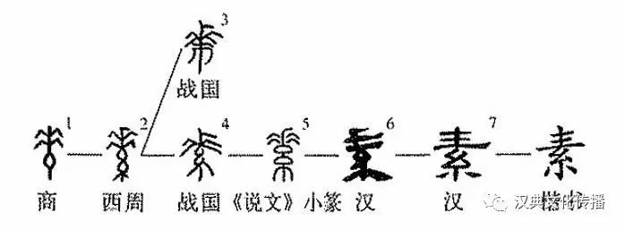 ,會意。”上舉字形3下部所從之“巿',(古代一種服飾),與從“糸”義通。字之上部“垂”字經過隸變,線條拉平直了,變成了三橫一豎,最后形成現在“素”字的寫法。素、索本一字分化。“索”字甲骨文作