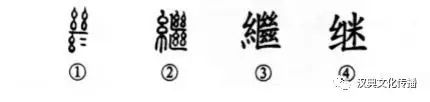這是“夜以繼日”的“繼”字,本為象形字。①是金文的形體,像絲連續(xù)之形,故有“繼”義。②是小篆的形體,左邊又增加“絲”,右邊仍為絲的接續(xù)。③是楷書繁體字。④為簡(jiǎn)化字。