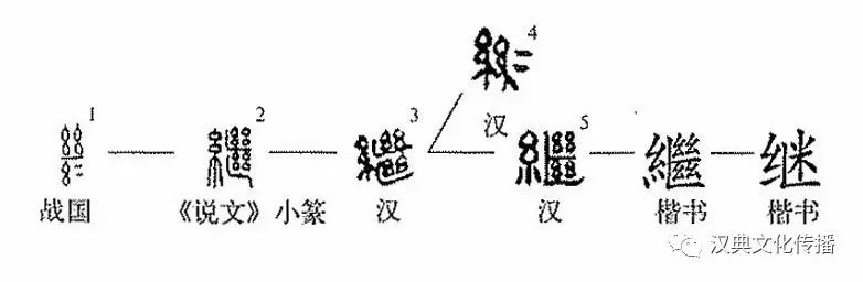 指事字。戰(zhàn)國(guó)文字“繼”字從二絲(右下“二”為省略符號(hào)),中間橫筆表示接續(xù)。漢帛書“繼”字仍從二絲,從二(省略符號(hào))。《說文》“一曰:反為繼”,此說不確。“反