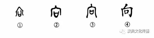 這是“眾葩敷榮向春風”的“向”字,本為象形字。甲骨文①就像一座房子,在墻壁上開了一個窗子。金文②和小篆③都同于甲骨文。④是楷書的形體,已經看不出房子的墻壁上有窗戶的形象了。