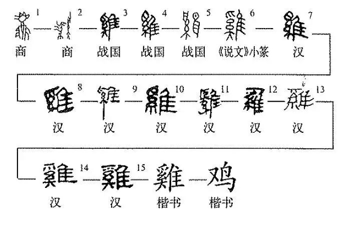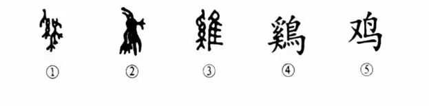 初為象形字,商代甲骨文像高冠長喙之雞。在商代就發展為形聲字。形旁鳥像禽鳥形(《說文》本把雞看作鳥類),表示雞的本義與禽鳥有關。聲旁奚為從爪、從大、從糹,糸亦聲之會意兼形聲字,本義是奴隸,于雞表音,雞與奚并為牙音、支部。象形的雞是形聲字雞的一個源頭,形聲雞的另一個遠源、聲首是糸(mì),近源、準聲首是奚,糹與奚并見于甲骨文。糸是束絲之形,其與構件大(人形)、爪(手形)結合而為奚(會以手持繩牽奴隸意),奚與象形的雞結合而為形聲字(也不排除先以奚為雞,后為造專字,天星觀遣策即以奚為雞)。商代形聲字雞的偏旁尚不固定,聲旁或在左,或在右,有的還省去了構件糹。《說文》籀文作“從鳥,奚聲”,戰國文字草率,但基本結構與《說文》同。楷書作鷄,俗體。唐代碑刻或作。現代整理漢字時,以鷄為正體,簡化作雞。本義是報曉家禽。《后編》上14·10:“王田……隻狐十……馬三、雞六。”《荀子·儒效》:“曾不如好相雞狗之可以為名也。”用作地名。《合集》37472:“戊寅卜,貞:王田雞,往來亡災?”用作人名。《前編》7.23.1:“乙丑卜,