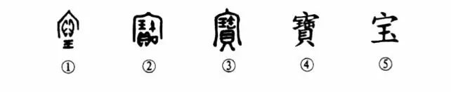 這個“寶”字較復(fù)雜。甲骨文①上部是一座房屋,屋內(nèi)有“貝”有“王”(“王”是大斧頭,代表政權(quán))。這就是說,當(dāng)時認(rèn)為有“權(quán)”有“貝”是最可寶貴的??梢娺@是個會意字。金文②又在甲骨文的基礎(chǔ)上增加了“杵”和“臼”之類的舂米用具,這是生活的必需品,所以都是“寶貝”。③是小篆的形體,“王”和“貝”都在,只是把“杵”和“臼”變成了“缶”字。④是楷書的寫法,基本上同于小篆。⑤是簡化字,“宀”(屋)內(nèi)有“玉”就是“寶”,這就成了一個新的會意字。