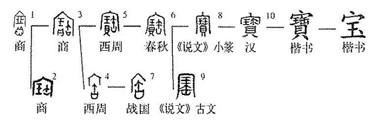 ”。漢代隸書中,有把“寶”改為從宀、從珍或珎(“珍”的異體)、從貝的,作“寳”或“寶”形。更有省去“貝”和“缶”的,變成從宀、從王(“玉”篆文以前的寫法),后代書法家有寫這個簡體的,并把“王”寫成“玉”。新中國成立后整理漢字時,廢除了“寶”的異體“寳”;簡化漢字時,采用了源自隸書的簡體“寶”,而把“寶”作為繁體廢棄掉了。(張玉金)