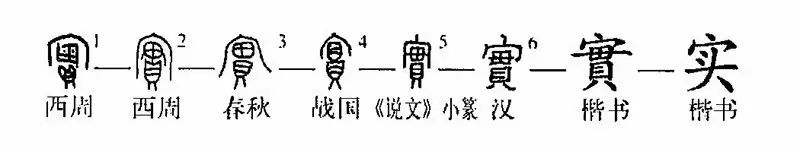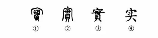 “傳聞之事,恒多失實?!边@個“實”字本為會意字。①是金文的形體,其上部為“宀”,即房屋之形,屋內有“貫(錢財)”。②是小篆的形體,與金文形體相似。③是楷書繁體字。④為簡化字。