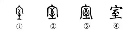 “室雅人和美。”這個“室”字本為會意兼形聲的字。甲骨文①的上部為房屋之其內為“至”,既為讀音,也表示“止息”之義。②是金文的形體,與甲骨文甚似。③是小篆的形體。④為楷書的寫法。