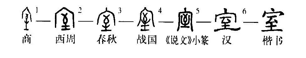 音兼形聲字。從宀,從至,至也表音。《說文》:“室,實也。從宀,從至。至,所止也。”徐鍇系傳:“室,實也。從宀,至聲。室、屋皆從至,所止也。”本義是居室、房間。唐玄應《一切經音義》卷六:“戶外為堂,戶內為室。”《論語·先進》:“由也,升堂矣,未入于室也。”引申有房屋、家人、家產、妻子、朝廷、墳墓和刀劍的鞘等意義。(張玉金)