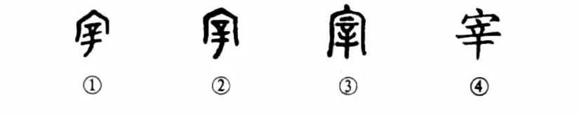 這個“宰”字。也是會意字。甲骨文①在“宀”(屋)內有“辛”,“辛”字本為平頭刀之形.也就是說在屋內以刀操勞即為“宰”,所以“宰”本為奴隸。②是金文的形體,沒有什么變化。③是小篆的形體,筆畫較甲、金文多了幾筆。楷書④是直接由小篆演變而來。