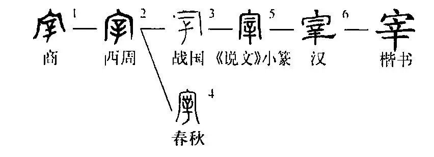 會意字。《說文》:“宰,辠(罪)人在屋下執事者。從宀,從辛。辛,辠也。”此字所從的“宀”代表房屋,所從的“辛”代表與罪過刑罰有關的意義。本義是充當家奴的罪人。引申有官名、主宰者、治理、殺牲、墳墓等意義。可通假為“采”(cài),有“封邑”的意義;通假為“滓”(zǐ),有渣滓的意思。(張玉金)