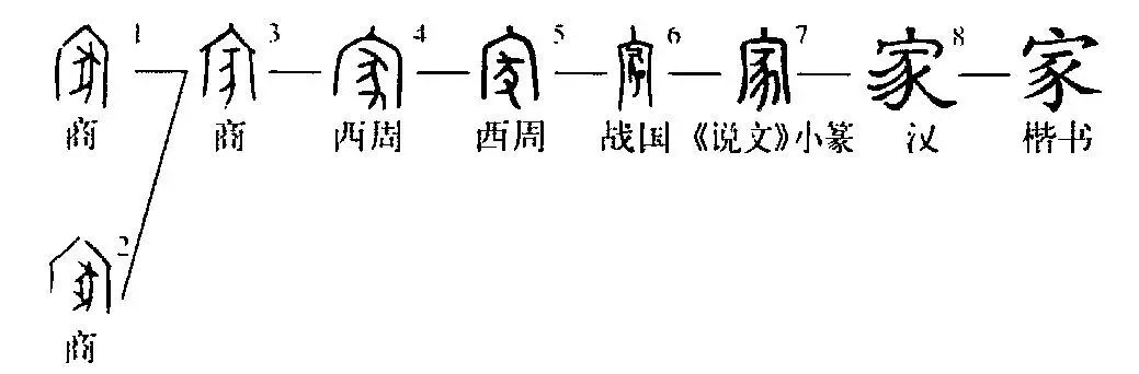 會意兼形聲字。《說文》:“家,居也。從宀,豭省聲。”又說:“豭,牡豕也。”此說有據。在商代甲骨文中,“家”有兩種寫法,一種是“宀”(房屋的象形)中的豕為雄性的(腹部有突出的雄性生殖器),另一種較簡單的寫法,不強調性別。突出雄性生殖器的“豕”應是“豭”的象形初文,是兼稱聲符的。而不強調性別的“豕”則是省形。到了周代金文中以不強調性別的寫法為主,后世的“家”字就是由這種寫法演變而成。在商代甲骨文中,“家”中的“豕”大多是畫出豬體的輪廓,也有只畫出豬體的線條的,周代金文的“家”是由這種簡便的寫法演變而成。在甲骨文中出現了省略像豕的前蹄的筆畫的寫法,但周代金文則是由甲骨文的完整寫法演變而成。另外,在周代金文中“豕”的原像豬的后蹄和豬尾的筆畫是連成一筆的,一直到西漢隸書中才分成兩筆,到了東漢隸書中又分成三筆,書寫更便利了。(張玉金)