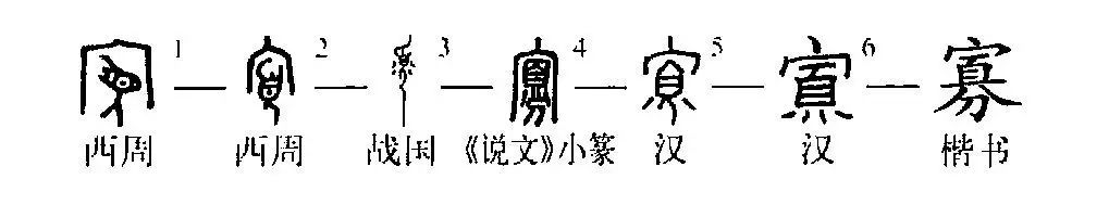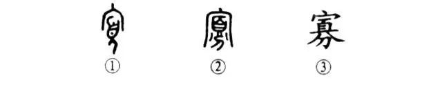 這是“寡不敵眾”的“寡”字,是個會意字。你看了甲骨文①的形體,也許就會了解個大概的意思:外面是一座房子,里面只有一個人(頭上還長著長頭發,有身子和手臂),這當然就有“少”的意思了。小篆②則把房內之“人”變得更復雜了,變成了上“頁”下“分”。③是楷書的形體,是由小篆變來的,從組成的各個部分來說,基本上沒有變化。