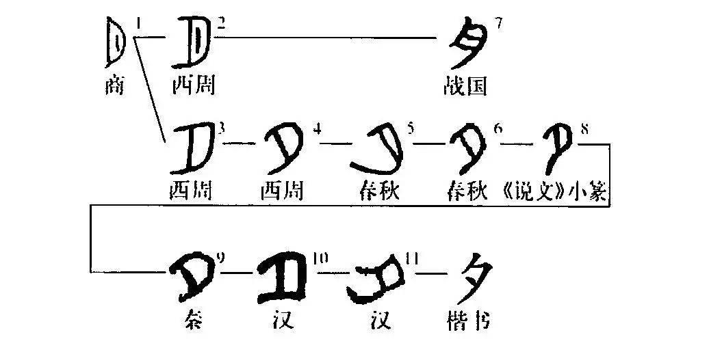 ”,像月出之形。金文多作“夕”。“夕”與“月”本為一字,后來才分化為兩字。《說文》:“夕,莫也。從月半見。”所以“夕”的造字本義就是“暮夜”之意。甲骨文:“戊戌卜,永貞:今日其夕風?”(《合集》13338)又:“貞,今夕其雨疾。”(《合集》12670)也引申為動詞,指夜晚祭月。《國語·周語上》:“于是乎有朝日、夕月,以教民事君。”韋昭注:“禮:天子以春分朝日,以秋分夕月。拜日于東門之外,然則夕月在西門之外必矣。”后泛指時間。《詩·小雅·白駒》:“縶之維之,以永今夕。”毛傳:“夕猶朝也。”也假借為“汐”。《荀子·禮論》·“月夕卜宅。”楊倞注:“月夕,月末也。”還假借為“昔”等。(王志平)