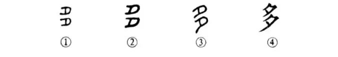 “梅開五福。竹兆三多。”這個“多”字是個會意字。在甲骨文①中,很像是重疊的兩個“夕”字。許慎說:“重也,從重夕,夕者相繹也,故為多。”其大意是:晝夜更替永遠不停,所以這就是“多”的意思。金文②和小篆③也都是兩個“夕”字。④是楷書的寫法,它與前幾種形體均相似。