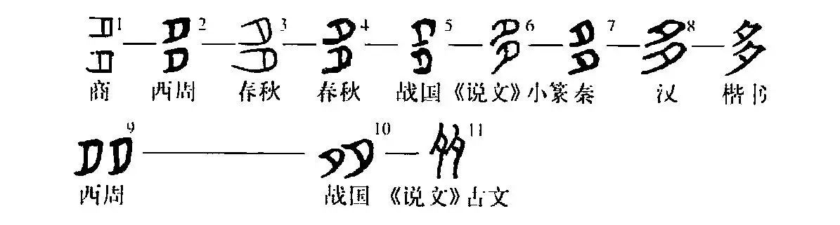 ,古文多。”所從字形已經訛變。造字本義是重復、眾多。甲骨文:“貞:生一月不其多雨?”(《合集》12501)《詩·周頌·訪落》:“未堪家多難。”鄭玄箋:“多,眾也。”引申為深厚。《漢書·趙廣漢傳》:“亭長戲曰:至府為我多謝問趙君。”顏師古注:“多,厚也。”也引申為重視。《漢書·灌夫傳》:“士亦以此多之。”顏師古注:“多猶重之。”又引申為欣賞。《呂氏春秋·謹聽》:“聽者自多而不得。”高誘注:“自多,自賢也。”也引申為軍功。《周禮·夏官·司勛》:“治功曰力,戰功曰多。”也假借為“衹”、“啻”等。(王志平)