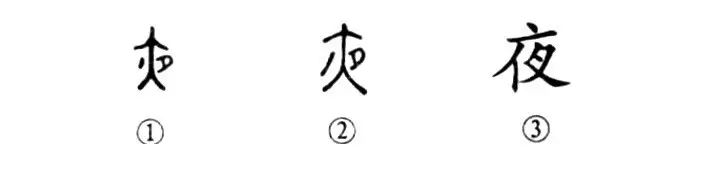 “夜來風(fēng)雨聲,花落知多少。”在甲骨文中至今還沒有發(fā)現(xiàn)“夜”字。金文①就像正面站著一個(gè)“人”(類似于“亦”字的甲骨文形體),人的右臂下的一點(diǎn)表示這里就是“腋”下。他左臂下是個(gè)“月”,表示月亮已經(jīng)升到人的腋下那么高了,這就是“夜間”到了。小篆②大致同于金文,其左臂之下也是“月”形。楷書③變化較大,已經(jīng)很難看出“夜”的意思了。