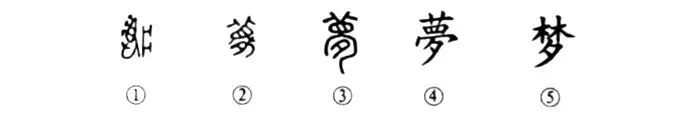 這是“夢筆生花”的“夢”字,本為會意兼形聲字。①是甲骨文的形體,右邊是一張床形,左邊是一個人躺在床上,手撫額頭在做夢。這個突出眼眉的人形也表聲。②是楚帛書文字的形體,基本上失去了原形。下部增加了“夕”,表示夜晚做夢。③是小篆的形體。④為楷書繁體字的寫法。⑤為簡化字。