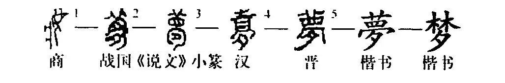 請注意:《說文》將“夢”與“?”分為二字,其實在上古本為一字,只是寫法稍有不同。《說文》:“?,寐而有覺也。”許慎以“?”為本字。