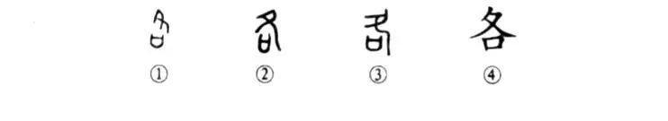 這個“各”字是個會意字。甲骨文①的上部是一只腳趾朝下的腳,其下部的“口”字是個門口,表示人從外面走進來的意思。②是金文的形體。③是小篆的形體,都與甲骨文相似。④是楷書的寫法。
