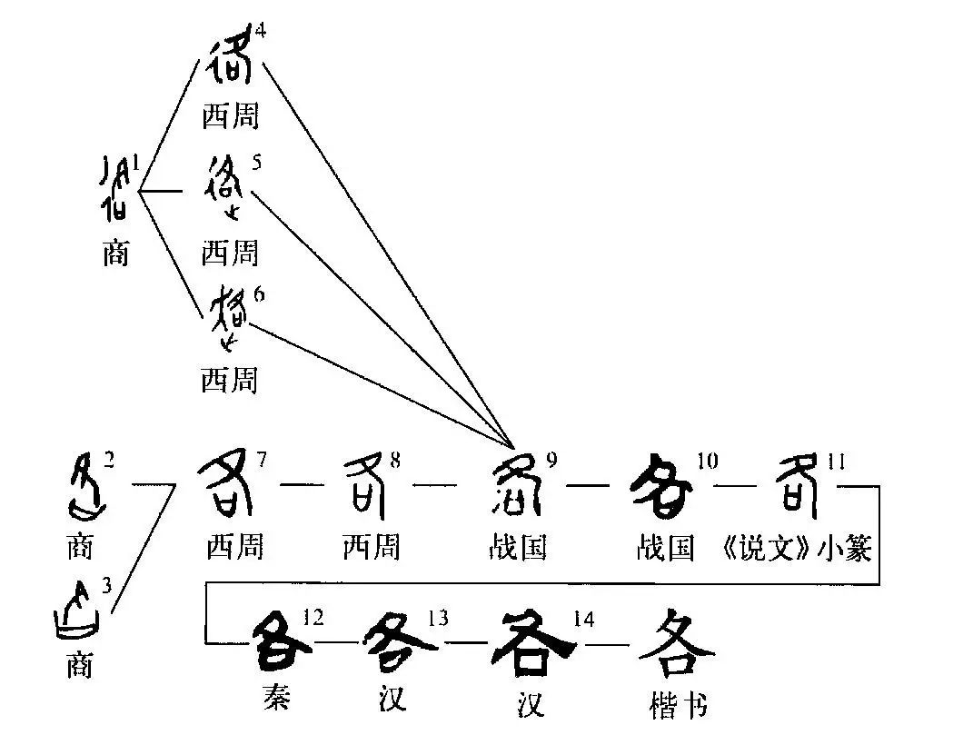 會意字。從夂,像倒趾之形;從凵,像坎穴之形。古人穴居,凵即像其形,以足向居穴以會來至之義。典籍通作“格”?!案鳌北韥碇林x,甲骨文因而或加“彳”旁以明行來之義。西周金文中從辵或走。《人》2941:“貞:王其各叀辛,王弗每(悔)?”(貞問:王在辛日來,王不會有災禍吧?悔,悔吝義,即指災禍)曶壺:“王各于成宮。”甲骨文、金文中均使用其本義?;蛴米鳌翱汀保翱汀迸c“各”同源。越王鐘(《集成》144):“我臺(以)樂……大夫、賓各(客)。”或借為“格殺”之“格”。兮甲盤:“各(格)伐獫狁。”此義之“各”,《說文·手部》作“挌”(訓“擊也”),《廣雅·釋詁三》作“??”(訓同《說文》)?!案鳌保?strong>《說文》訓“異辭也”,即今日所說的各自義,此義產生較晚,約出現于戰國時期,如睡虎地秦簡《法律答問》139:“當貲各二甲。”馬王堆三號墓遣策:“鐃鐸各一。”(陳英杰)