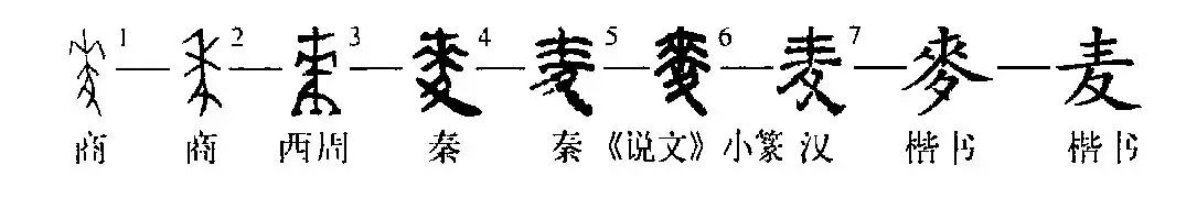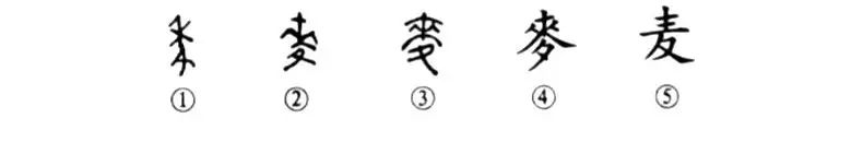 這是個(gè)“麥”字。從甲骨文①的形體看,其上部是一棵小麥形,麥穗朝左,麥下就是一只腳趾朝下的腳(倒“止”)。凡是腳都有“走”的意思,所以這個(gè)“麥”字本來就是“來去”之“來”的本字,而“來”倒是“麥”的本字。可是在卜辭中使用“麥”字較少,而使用“來”字極多,所以這就發(fā)生了互換現(xiàn)象。把原來當(dāng)“小麥”講的“來”,變成了“來去”之“來”;把本來當(dāng)“來去”講的“麥”,變成了“小麥”的“麥”。這一交換再也沒有還原過。金文②仍然是上為“麥”形,下為一只腳。小篆③也沒有大變,下部仍為腳形。④是楷書形體。⑤為簡(jiǎn)化字。