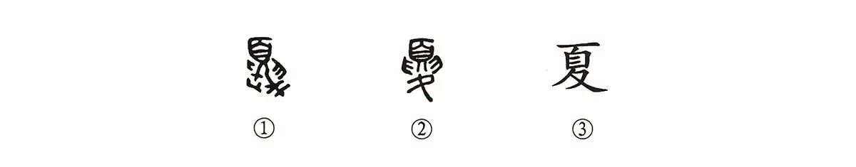 這個“夏”字的上古形體較為復(fù)雜。從金文①看,其上為“頭”,中間為“軀干”,兩側(cè)為“手”,其下為“足”,實際上就是“人”形。②為小篆的形體,也是“人”形,但已經(jīng)發(fā)生了偽變,人的身軀部分沒有了,只是一只大腳還在。③是楷書的形體,它是從小篆演變而來,根本看不出人的形象了。