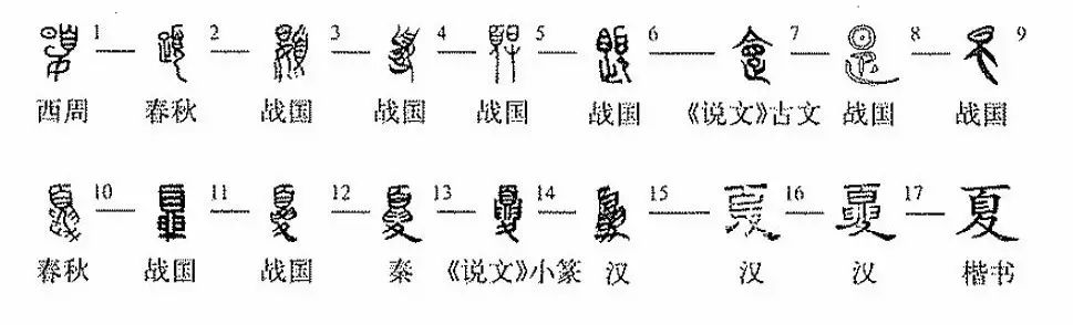 的寫法,可能是楚地的一種特殊寫法,也可能是表示夏季天氣炎熱有蟲類活動的會意字。周秦文字傳統(tǒng)寫法一脈相承,成為漢代隸定的根據(jù)。夏義指夏朝或夏族,亦指華夏。如秦公鐘:“