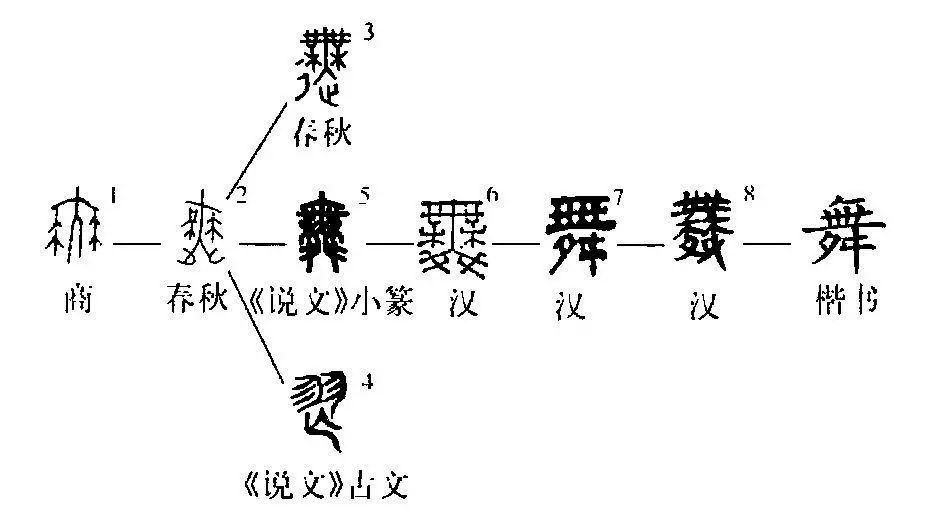 會意字。商代甲骨文舞之初文,像人兩手執牛尾之類的舞具而舞蹈之形。古代無、舞最初本一字,其后由于舞蹈是手舞足蹈,兩腳動作帶動全身,故特意在字下端添加“止”(足形),遂成為“舞”這種寫法。無、舞二字發生分化后,無多用為有無之無。春秋戰國時期,舞字像人兩手所持的舞具形發生訛變,字上端也發生形變,有的不從大(人形),而訛為從、從林的字。《說文》:“