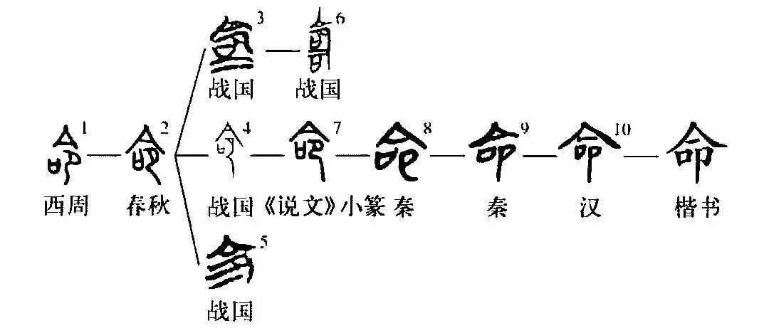 在甲骨文中“令”和“命”同字。你看“命”字,甲骨文①的上部也是一個屋頂(或大傘蓋),下部是一個面朝左跪坐的人在發布命令。可見這個“命”字是一個會意字。金文②的左下角又增加了一個“口”字,這就表示用“口”發布。③是小篆的形體,是由金文直接演變而來。④是楷書的寫法,其右下角的“人”形竟變成“卩”了。
