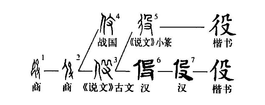 。商代到戰(zhàn)國(guó)的這種結(jié)構(gòu)一直沿用到后代,楷書作伇。《說(shuō)文》改變此結(jié)構(gòu)為從彳(chì,道路之象)從殳,屬于理?yè)?jù)重構(gòu),楷書作役。時(shí)殳或作