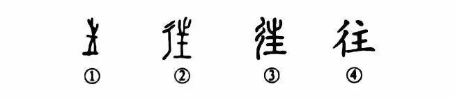 “寒來暑往,秋收冬藏。”這個“往”字本為形聲字。①是甲骨文的形體,上部是一只腳趾朝上的腳,下部的“王(斧頭形)”字表讀音。可見“往”字本為上形下聲的形聲字。②是金文的形體,左又增加了意符“彳”,表示行動。③是小篆的形體。④為楷書的寫法。