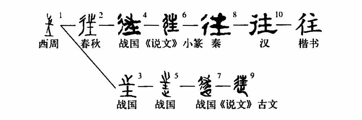 ,從止,王聲,為往之初文。春秋時期始加彳旁以強調行的意義。往在戰國時期字形比較多樣,或承襲甲骨文加以變形,作