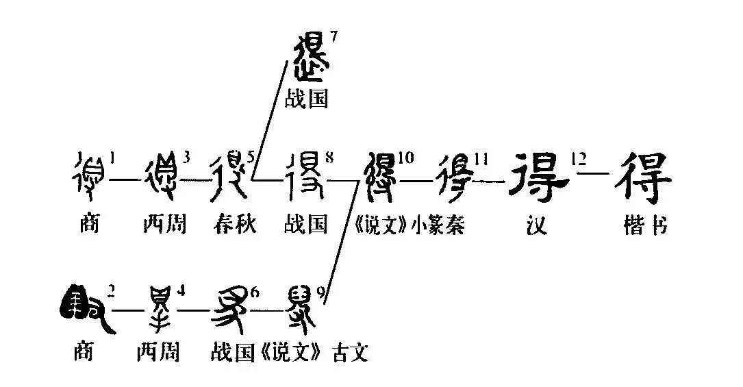 聲。古文省彳。”《說文》小篆得的聲符和古文得均從見,乃從貝之訛。貝在春秋戰國文字中或漸變為目形,又或近似見形,《說文》殆承此訛變。漢代隸書則逐漸變作了“旦”。