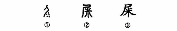 “屎”字是個(gè)會(huì)意字。甲骨文①實(shí)在形象,面向左側(cè)立的一個(gè)“人”,在臀部之后有五個(gè)小點(diǎn)兒,這就是人拉的屎。小篆②的上部“尸”也是人形,下部寫(xiě)作“米”,這說(shuō)明人的“屎”是由“米”經(jīng)消化以后變成的。③是楷書(shū)的寫(xiě)法,是由小篆直接演變而來(lái)。