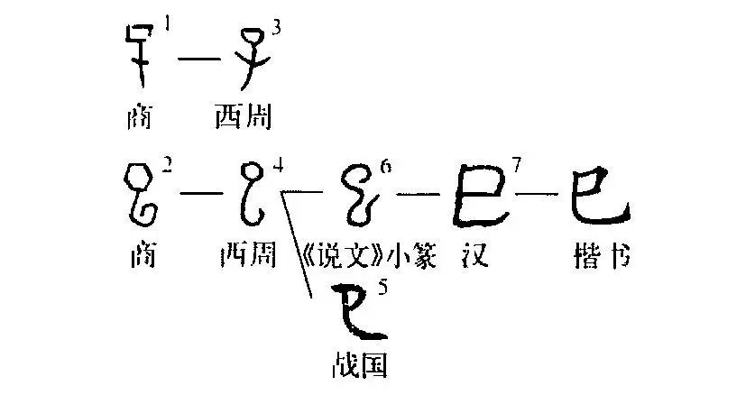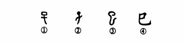 這個“巳”字讀作sì,本為象形字。甲骨文①就是“子”,郭沫若認為:“實象人形?!雹谑墙鹞牡男误w,與甲骨文的形體相類似,更像人。③是小篆的寫法,已發生了訛變。④是楷書,由小篆的形體演變而來。