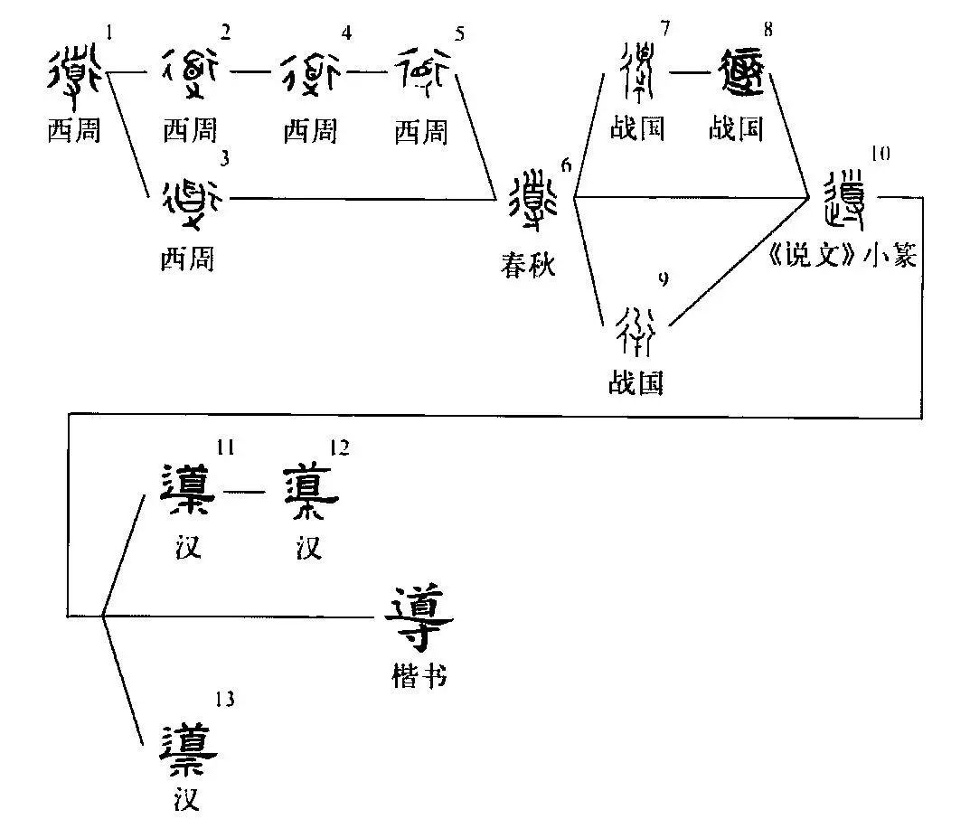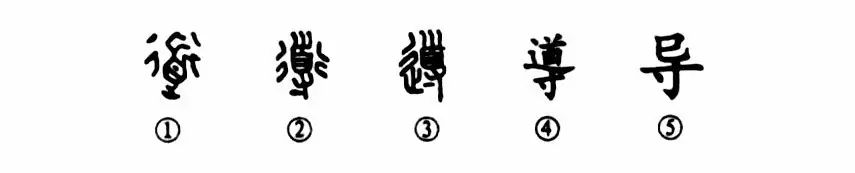 “導入柳溪仙境間。”這里的“導”字本為會意字。①是金文的形體,其外部為“行”字,表示十字路口。其中的上部為“首”,代表人;下部有“止(腳)”,表示行走。其大意是:人入十字路口,需要引導。所以“導”字的本義為“引導”。②是石鼓文的形體,其下部的“止”訛變為“寸(手)”。③是小篆的形體,又將外部的“行”變成了“辵”,但意義未變。④為繁體字。⑤為簡化字。