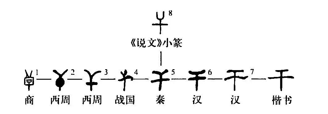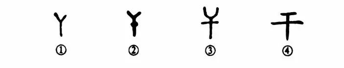 這是“大動(dòng)干戈”的“干”字。甲骨文①像一根上頭帶杈的木棍子。金文②在其上部又加上了一個(gè)大疙瘩。看來“干”字是一個(gè)象形字,是一桿鐵杈的形狀,在上古就是一種武器,如《韓非子·五蠹》“執(zhí)干戚(古代像大斧頭一樣的武器)舞”,即拿著武器跳舞的意思。小篆③也還有鐵杈的樣子。楷書④則把小篆上部的曲筆拉平。