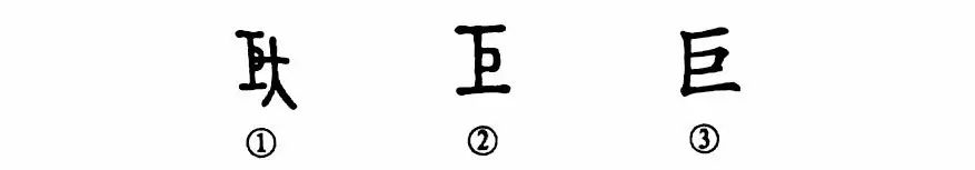這是“巨掌擎蒼天”的“巨”字。從金文①的形體看,右邊是一個正面站立的“人”,右手拿著一個量角度或量方形的工具。其實這個字本來就是“規矩”的“矩”字,“矢”為“人”形,“巨”為“巨”形,金文只不過將表示“人”形的“矢”移到了字的右邊。②是小篆的形體,把人形部分省掉了。③是楷書的寫法,基本上與小篆的形體相似。