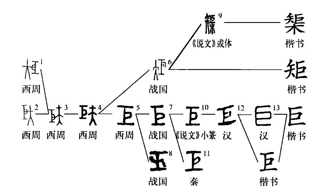”形徹底與人臂遠離。以后,“夫”形又訛作“矢”形,這就演變出了“矩”字。并由此產生了一個加“木”旁表義的異體字“榘”(參見“榘”字條)。戰國年間,“巨”字還出現過“