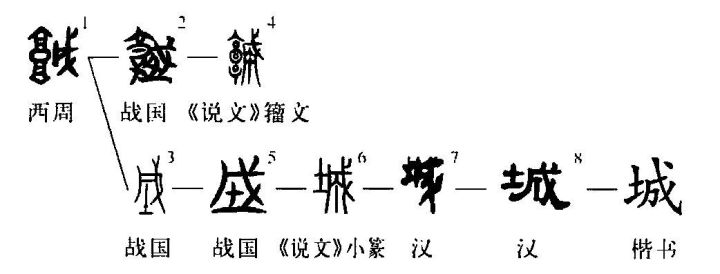 會意兼形聲字。從土,從成,成亦聲。先秦文字有兩個系統:一系從,—系從土。在“城”的意義上,從
