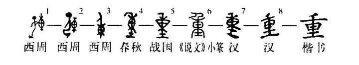 會(huì)意字。初文(如字形1)像一人身后背負(fù)盛得滿滿的囊橐,用以表示沉重義。后將形體進(jìn)行并劃性簡(jiǎn)化,即將人形豎畫和囊橐的象形文中的豎畫公用,使人形和囊橐形并和為一體,成為字形3那樣的形體。春秋以降,下面又增加了土旁。漢隸平直筆畫,人形和囊橐形全失。《說文》:“重,厚也。”段玉裁注:“厚斯重矣。引申之為鄭重、 重疊。”表厚重、沉重義,讀zhòng。引申之則為重大、重要、重視、重量、重任、重托等。重疊義,讀chóng。引申之則有重復(fù)、重逢、重合、重霄、重圍等。(董蓮池)