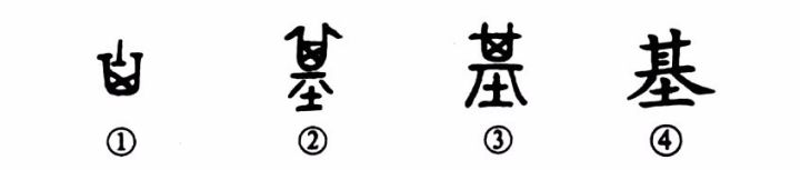 “賢智之土,邦國之基?!边@個“基”字本為會意兼形聲的字。甲骨文①的下部為“其(箕)”,箕中裝有“土”,為起土筑墻基之義。②是金文的形體,“土”移于“其”下,意義未變。③是小篆的形體。④為楷書的寫法。