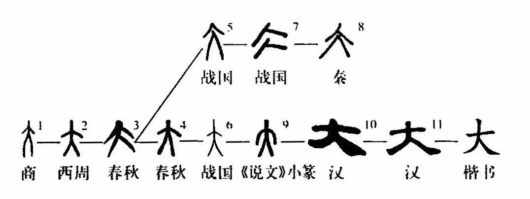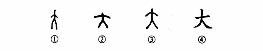 這個(gè)“大”字是個(gè)象形字。甲骨文①、金文②、小篆③都像“人”形。楷書④則把人的兩臂伸平變成了一橫,這樣“大”字就不像“人”形了。