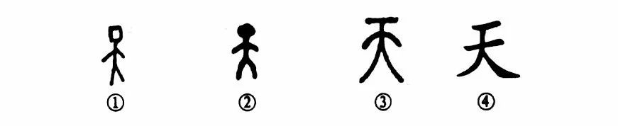 大道之行也,天下為公?!边@個“天”字本為象形字。甲骨文①就像正面站著的“人”形,突出了上部的方框“頭”。②是金文的形體,更像“人”形。③是小篆的寫法,上部的“一”仍表示“頭”。④是楷書的寫法。